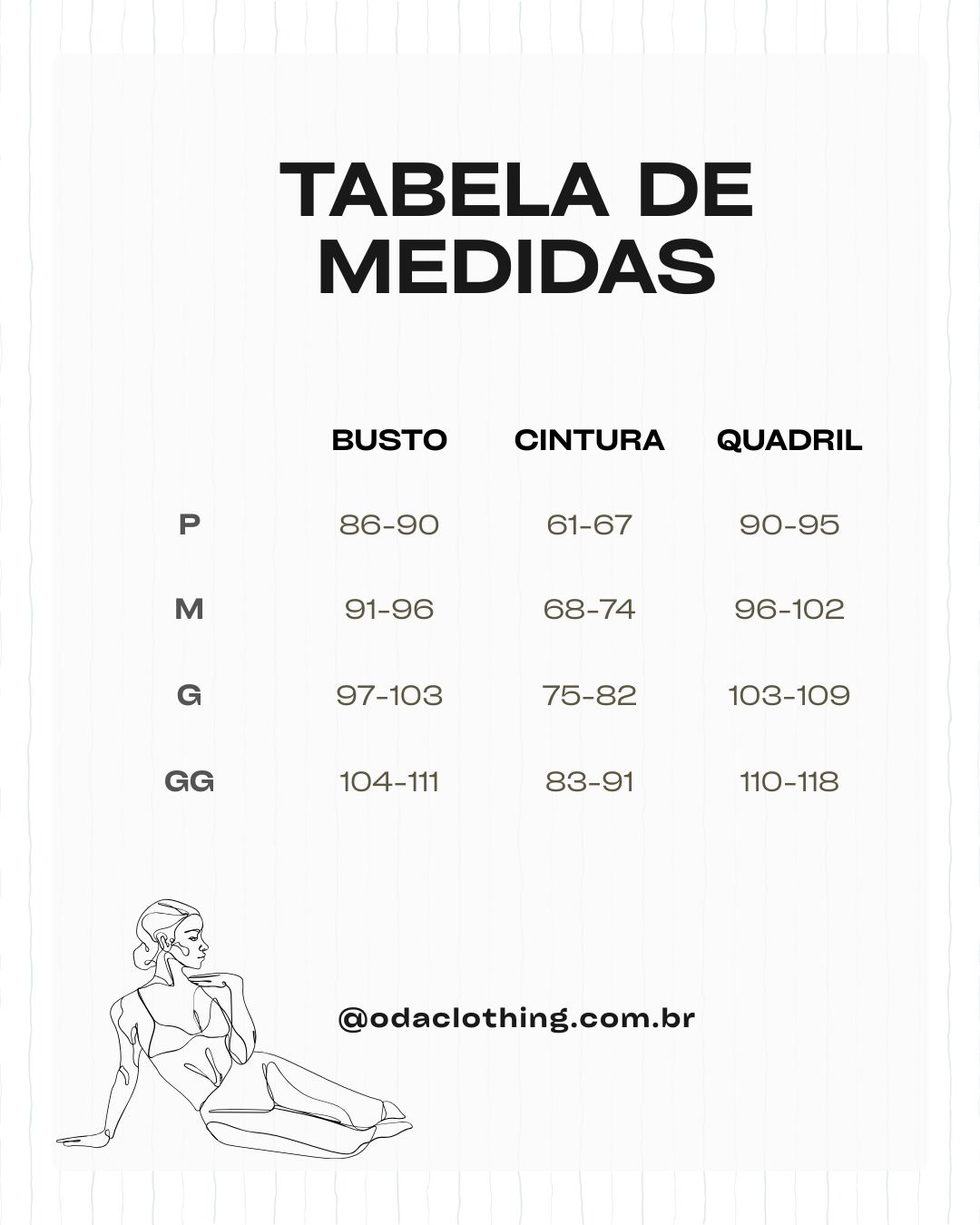 G – Busto: 97-103 | Cintura: 75-82 | Quadril: 103-109